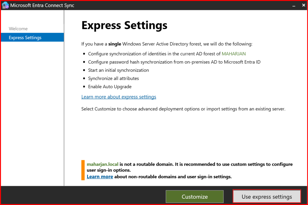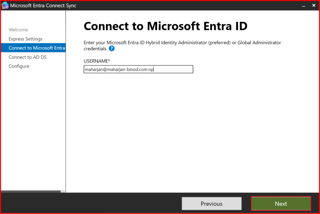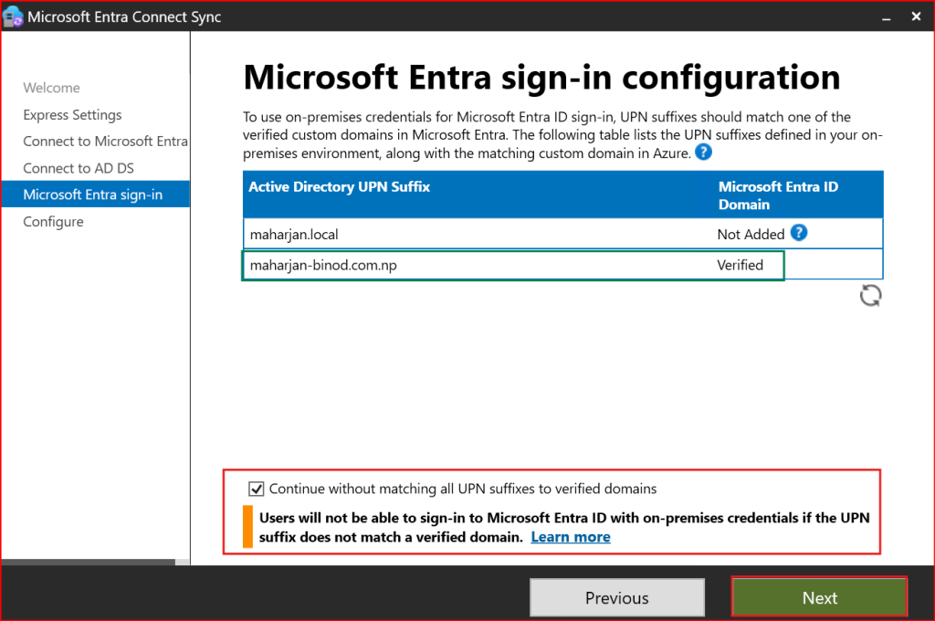 Azure AD Connect detects your AD UPN domain (example: maharjan-binod.com.np).