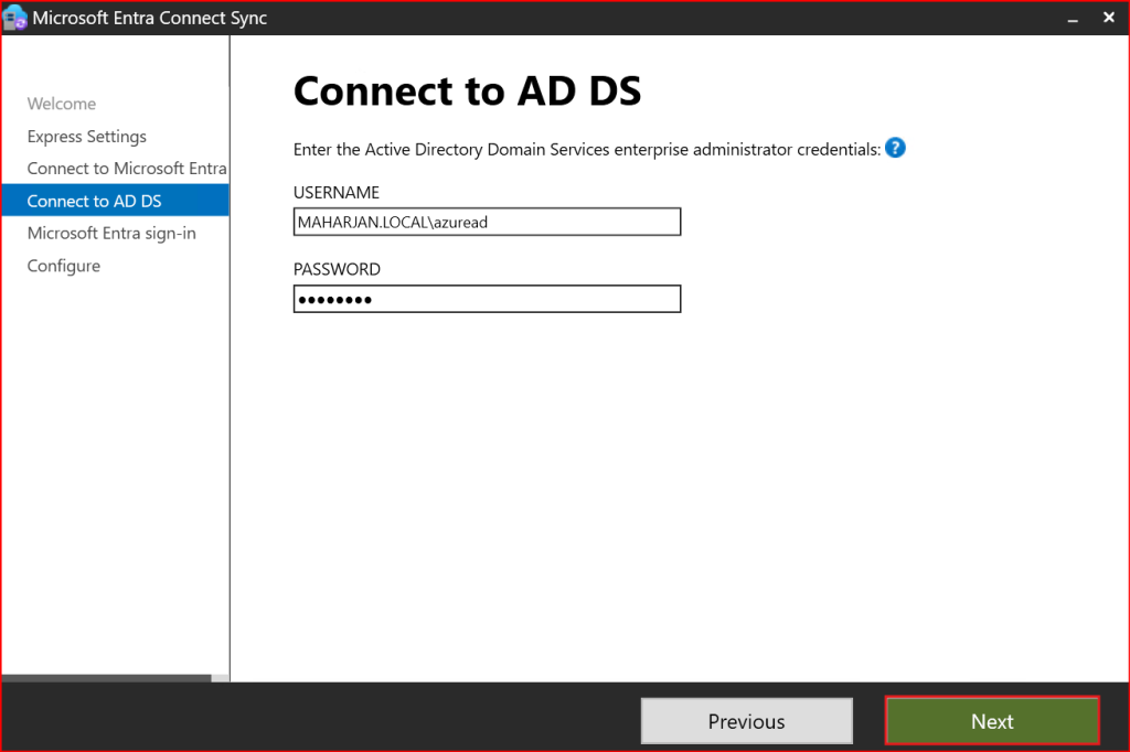 Now Azure AD Connect asks for on-prem AD credentials: