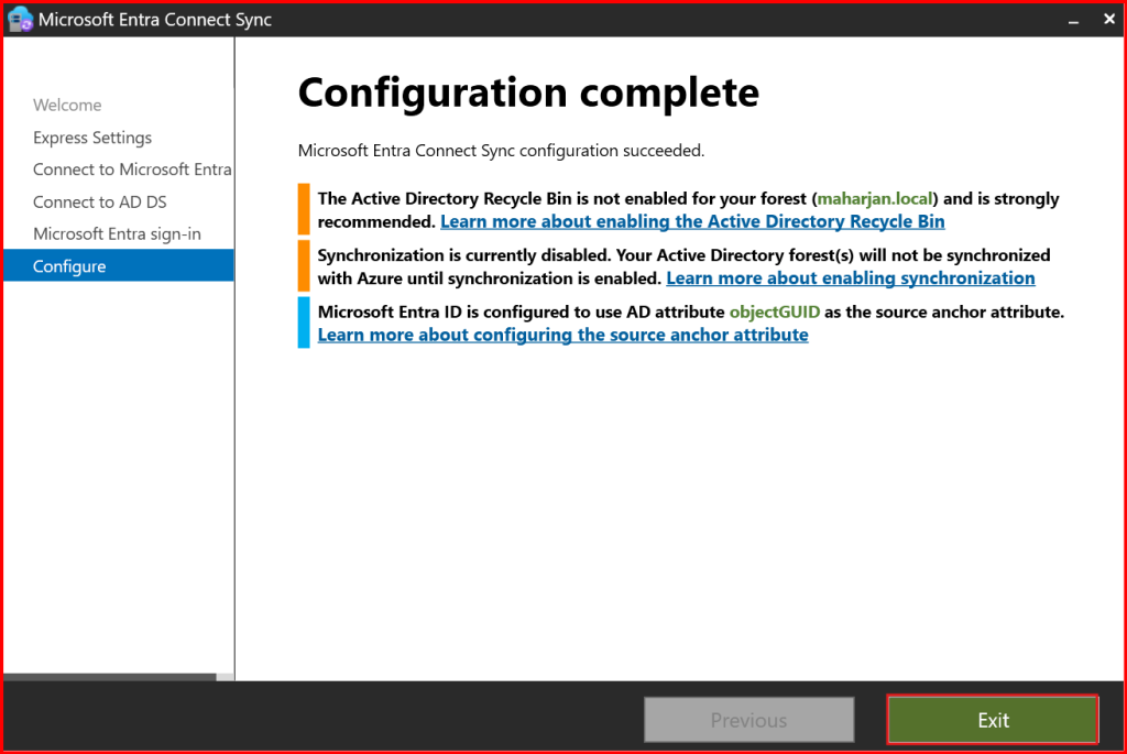 Once installation completes, Azure AD Connect runs its first synchronization.