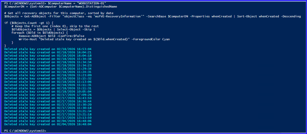 From a security and management perspective, having five different recovery keys for one C: drive is a recipe for disaster. Cleaning these up manually via the Active Directory Users and Computers (ADUC) GUI is tedious. PowerShell allows us to filter, identify, and remove these redundant objects efficiently.