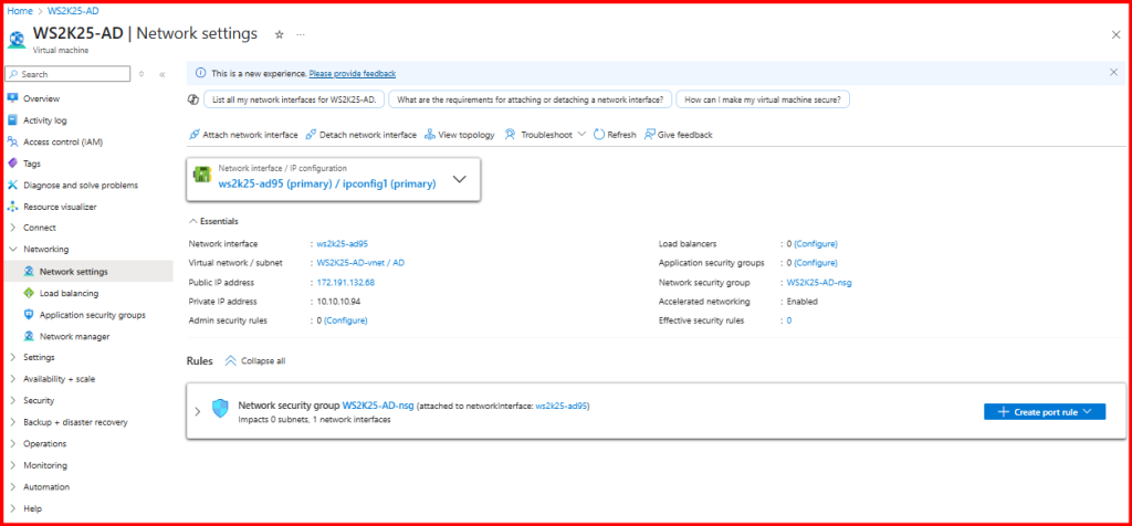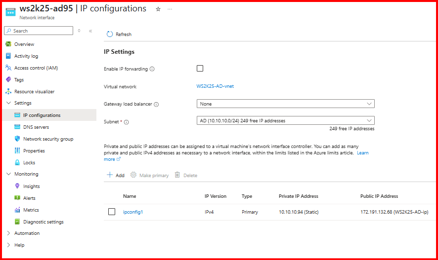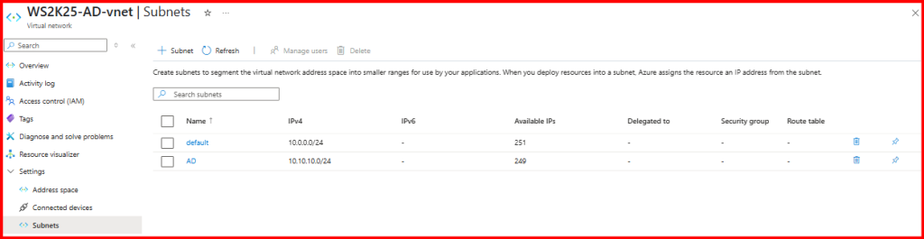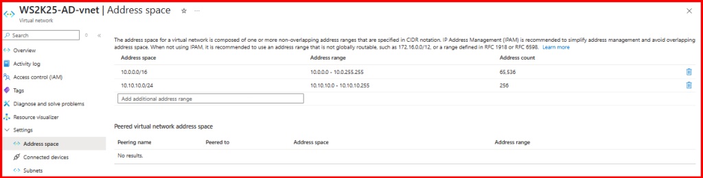 - Virtual Networks > [my VNet] (WS2K25-AD-vnet)> Address space