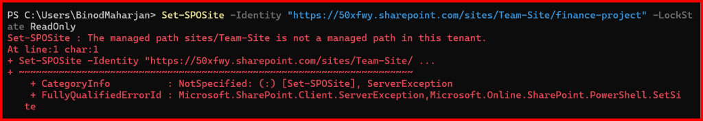 Set-SPOSite -Identity https://50xfwy.sharepoint.com/sites/Team-Site/finance-project -LockState ReadOnly