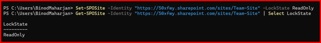 Get-SPOSite -Identity "https://50xfwy.sharepoint.com/sites/Team-Site" | Select LockState