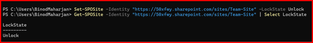 Set-SPOSite -Identity "https://50xfwy.sharepoint.com/sites/Team-Site" -LockState Unlock