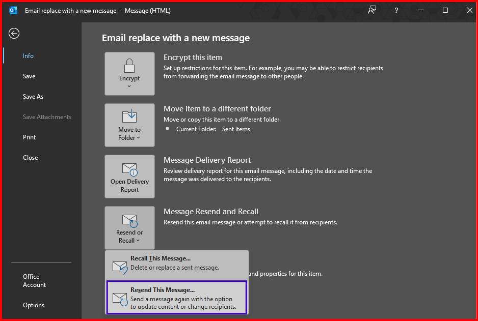 If you chose to replace the message, Outlook opens a new email window with the original content. Edit and click Send.