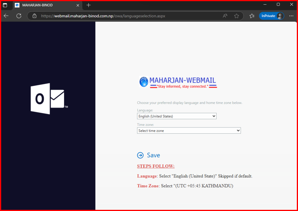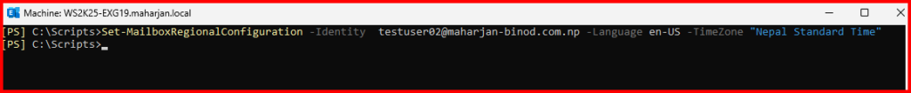 Set-MailboxRegionalConfiguration -Identity testuser02@maharjan-binod.com.np -Language en-US -TimeZone "Nepal Standard Time"