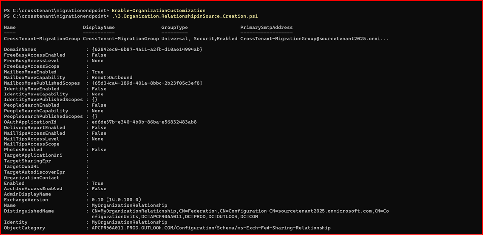 New-OrganizationRelationship “MyOrganizationRelationship” -Enabled:$true -MailboxMoveEnabled:$true -MailboxMoveCapability RemoteOutbound -DomainNames $targetTenantId -OAuthApplicationId $appId -MailboxMovePublishedScopes $scope