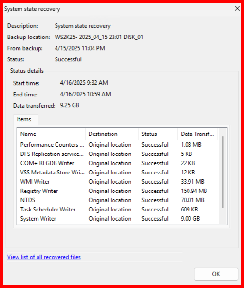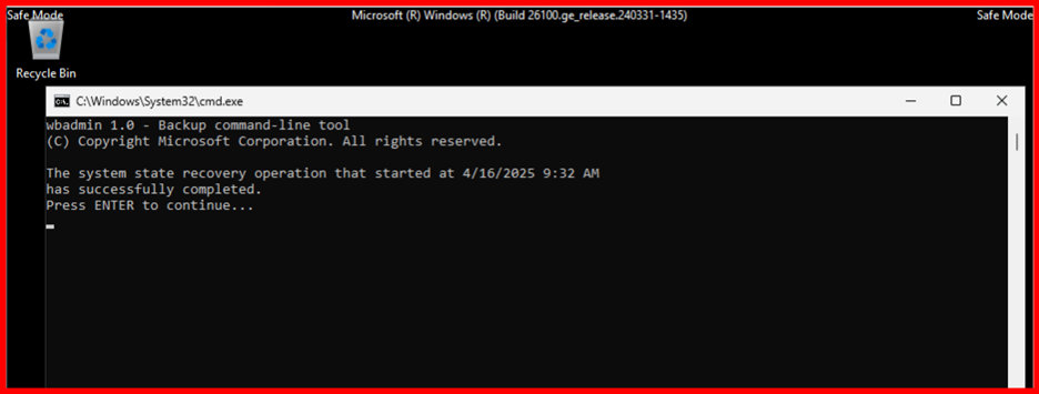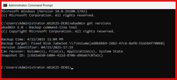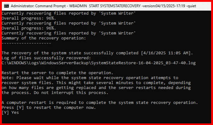 WBADMIN START SYSTEMSTATERECOVERY -version:04/15/2025-17:19 -quiet