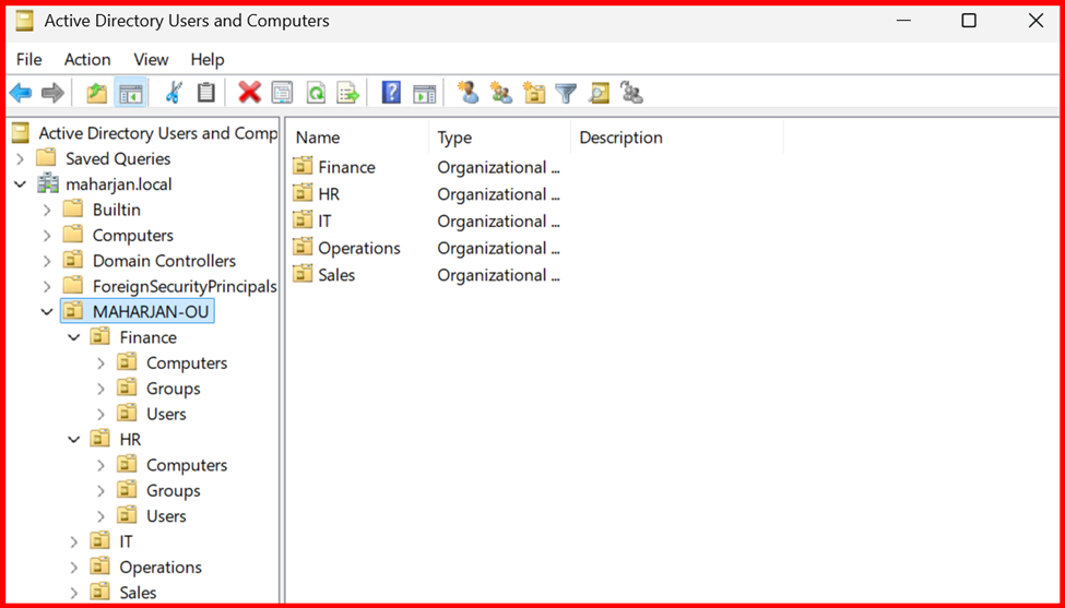 Sales,IT,HR). - Move objects (users, computers) into the OU by dragging or using Move.