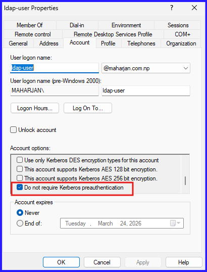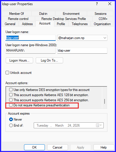 - Step 2: Uncheck “Do not require Kerberos preauthentication” in the Account tab of the user properties.