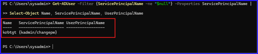 Select-Object Name, ServicePrincipalName, UserPrincipalName