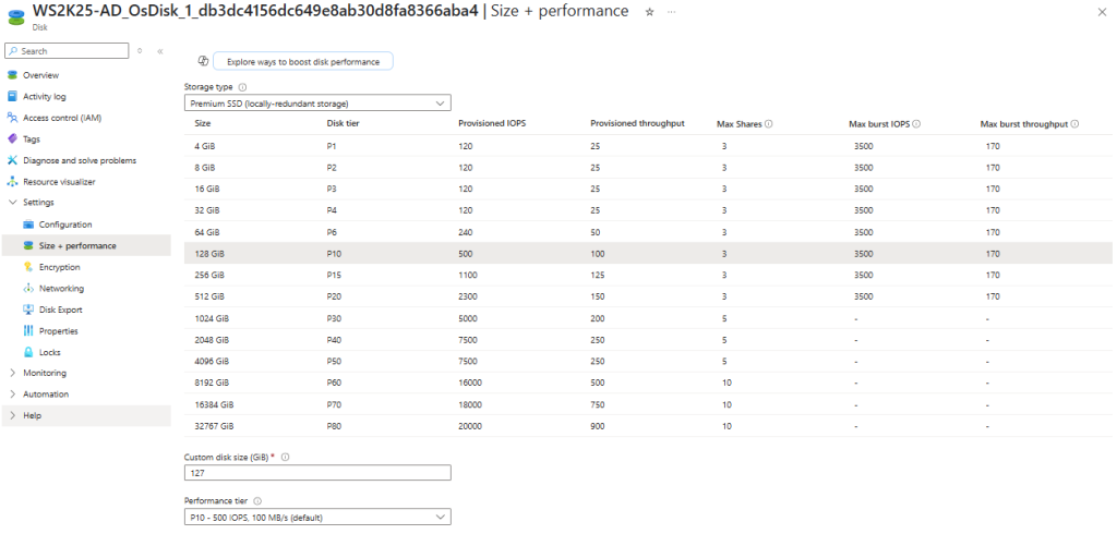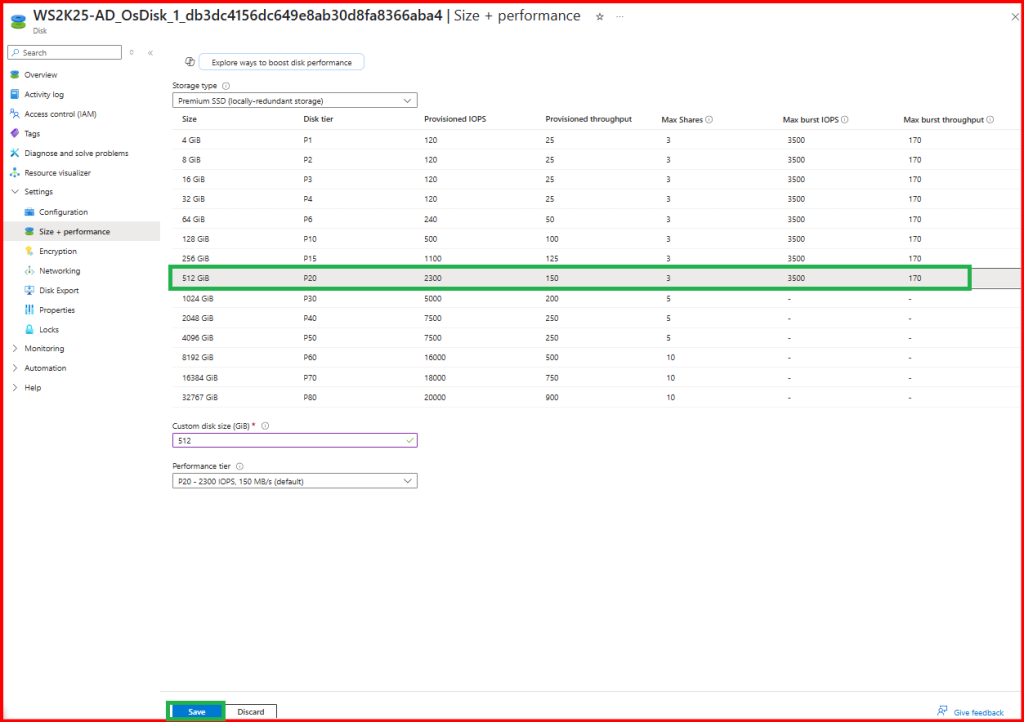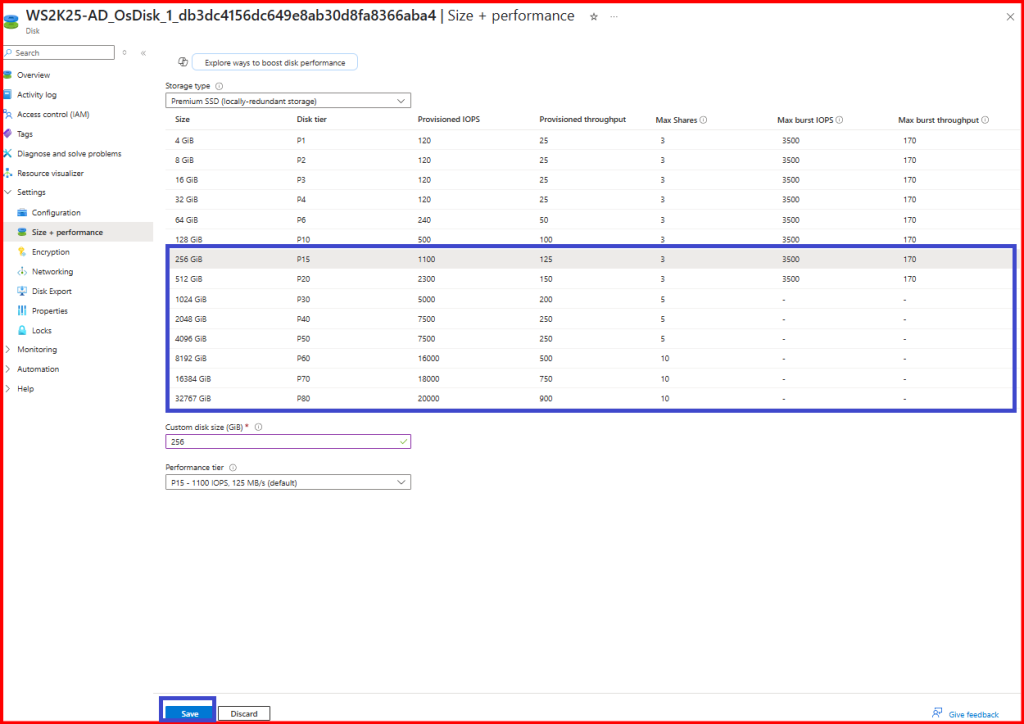 - Configure the size, performance tier, and encryption
