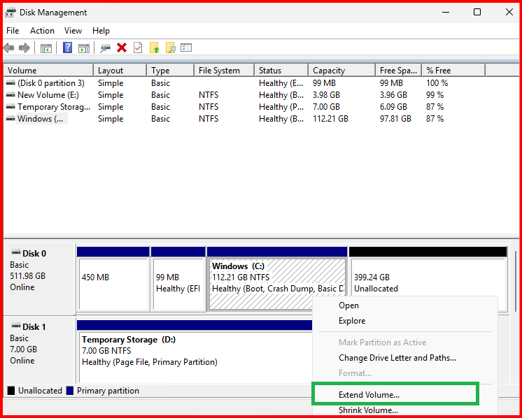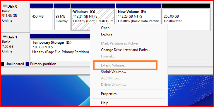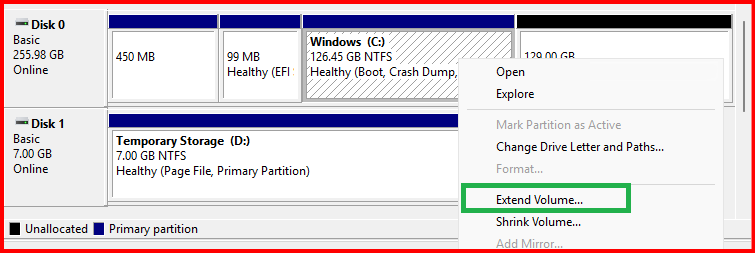 - Right-click the volume → Extend Volume