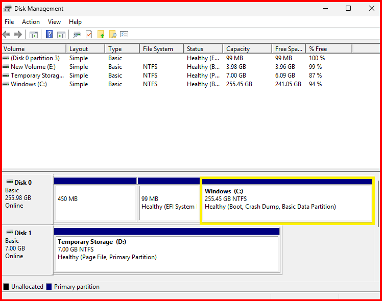 diskmgmt.msc) - Locate the OS volume (e.g., C:\ )