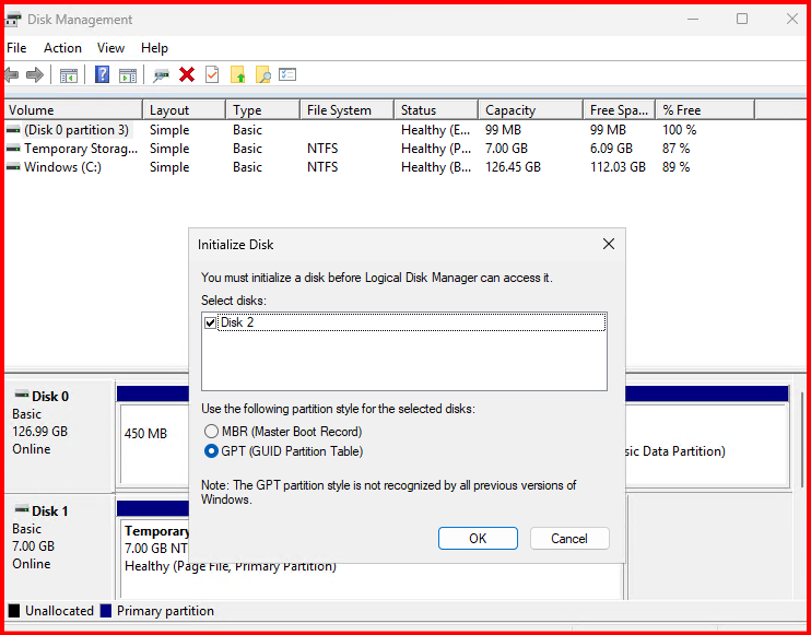- Initialize the new disk (GPT recommended)