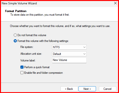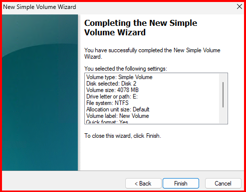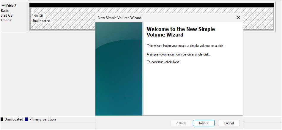 - Create a New Simple Volume and assign a letter