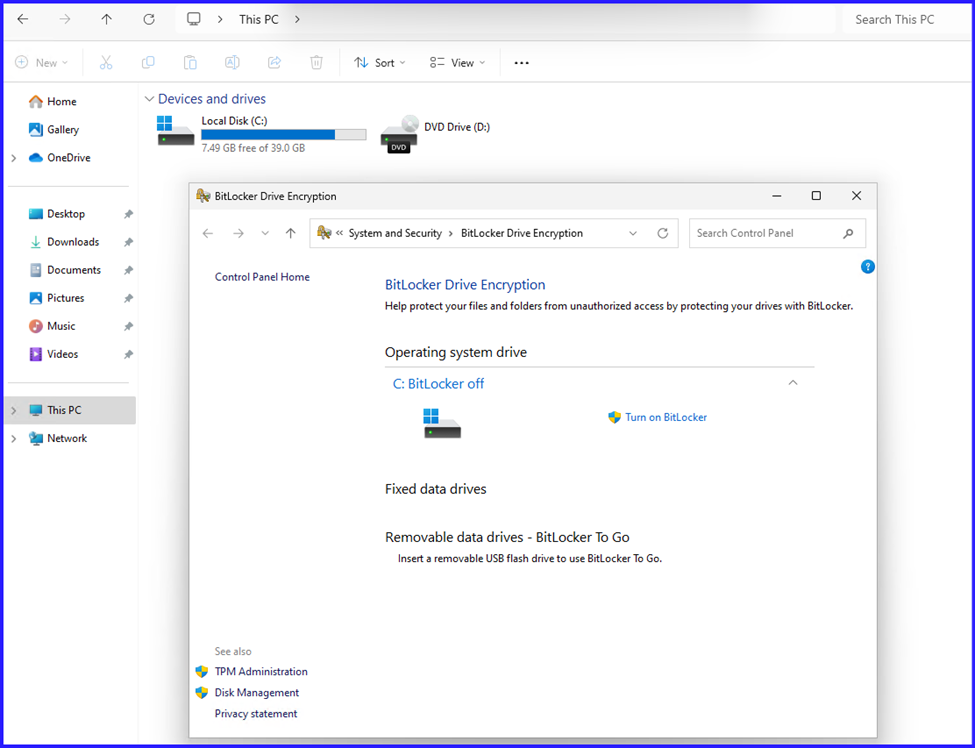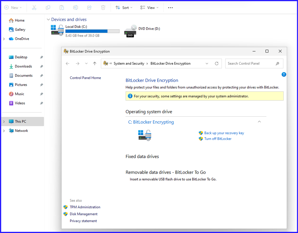 Step5: Prior to rebooting, verify the encryption status of the Local Disk (C:) on the workstation to ensure the BitLocker process has initialized correctly.