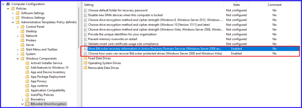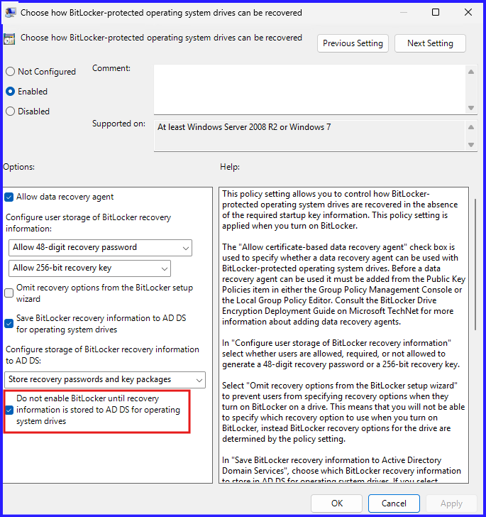 - Crucial Setting: Under the specific drive folders (OS/Fixed), enable the policy to “Do not enable BitLocker until recovery information is stored in AD DS.” This prevents “orphaned” encrypted drives with no known recovery key.
