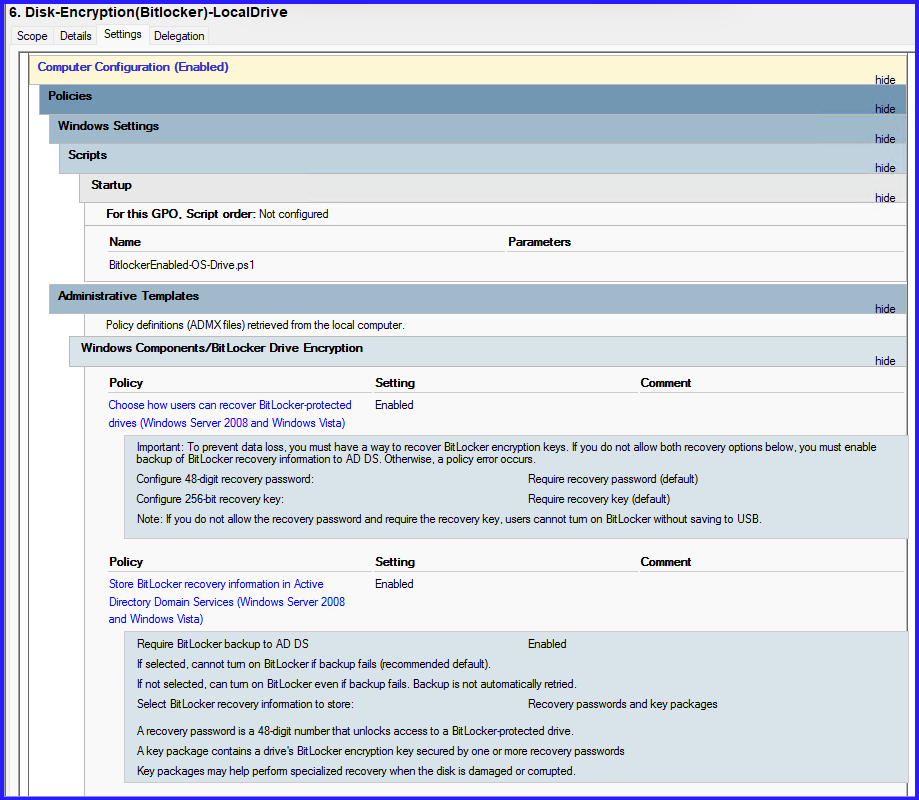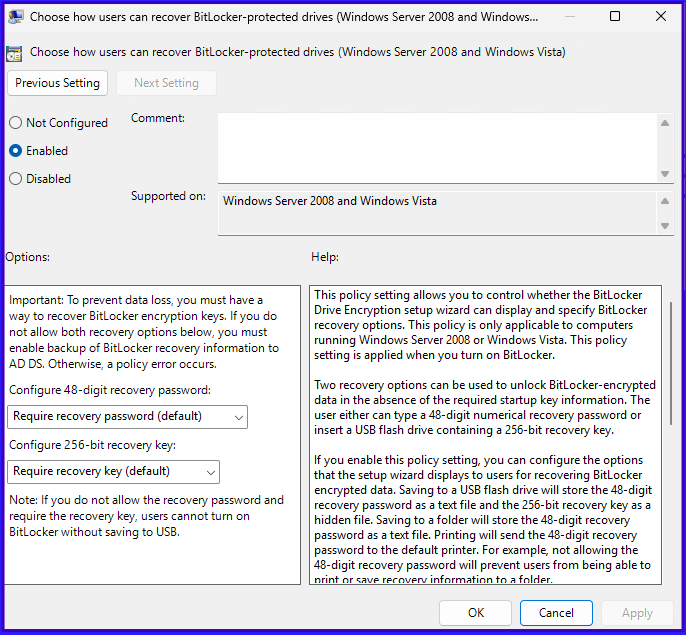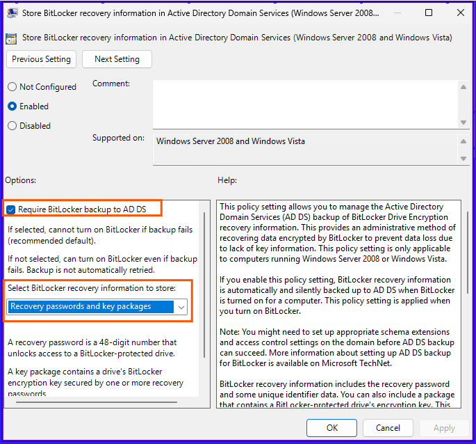 - Store BitLocker recovery information in Active Directory Domain Services: Set to Enabled.