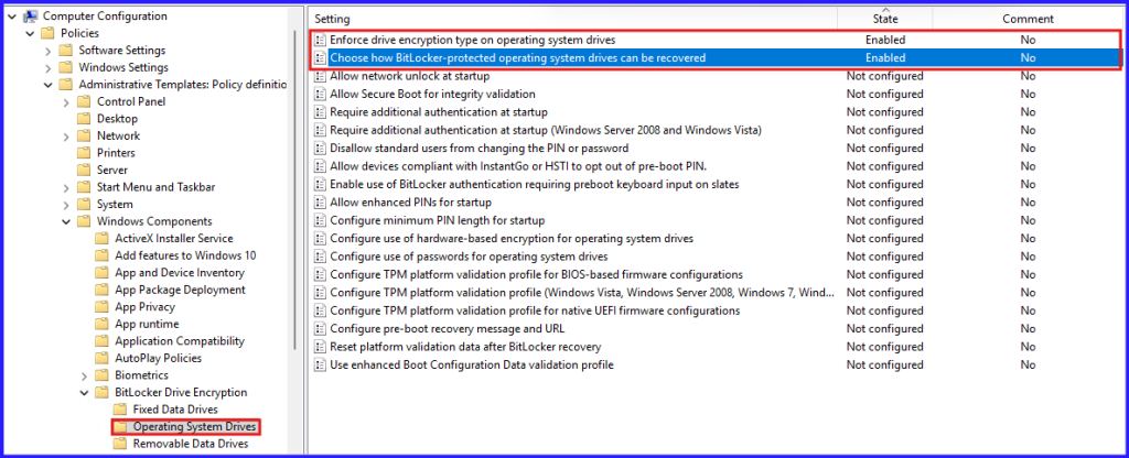 The Path: Computer Configuration > Policies > Administrative Templates > Windows Components > BitLocker Drive Encryption