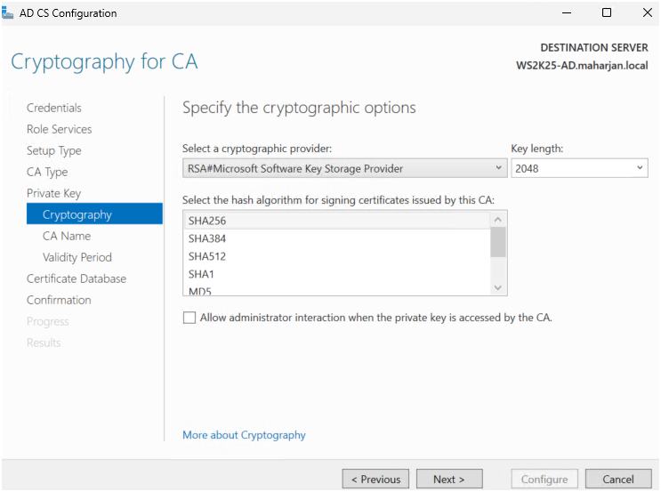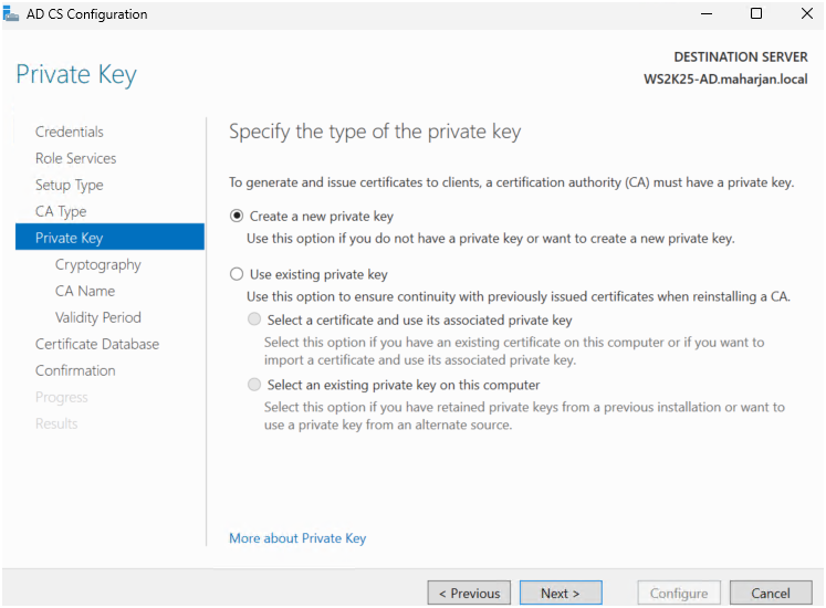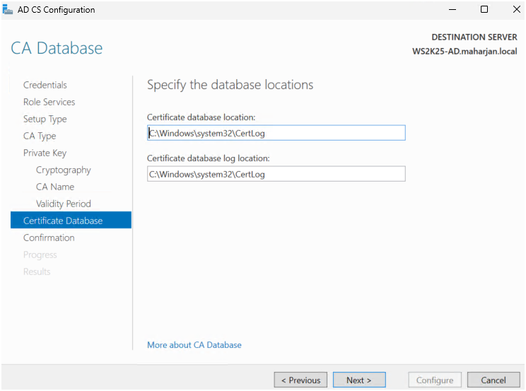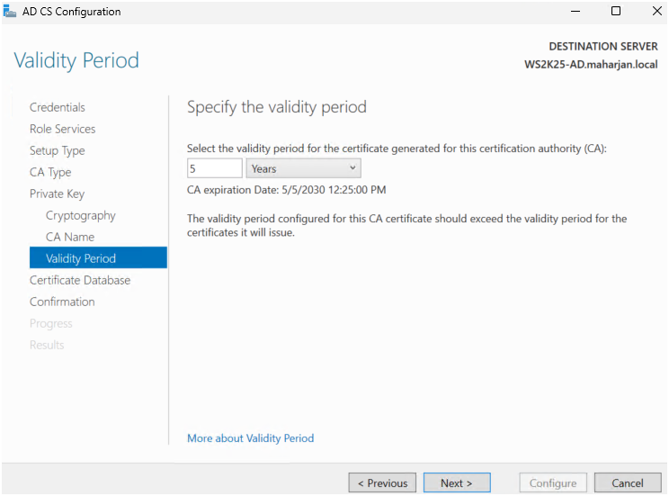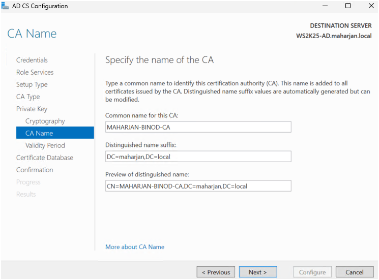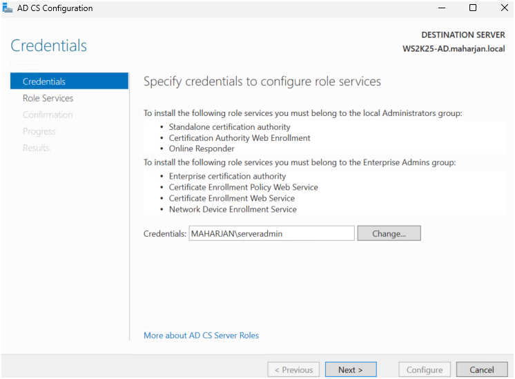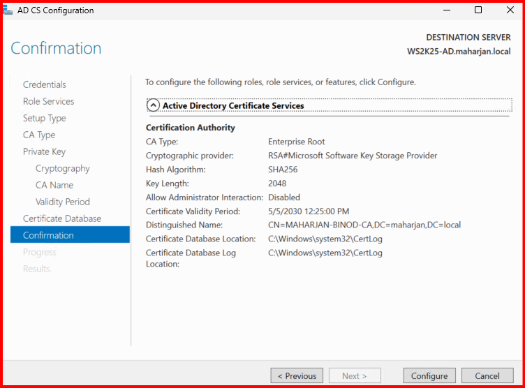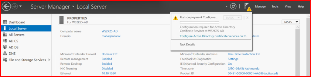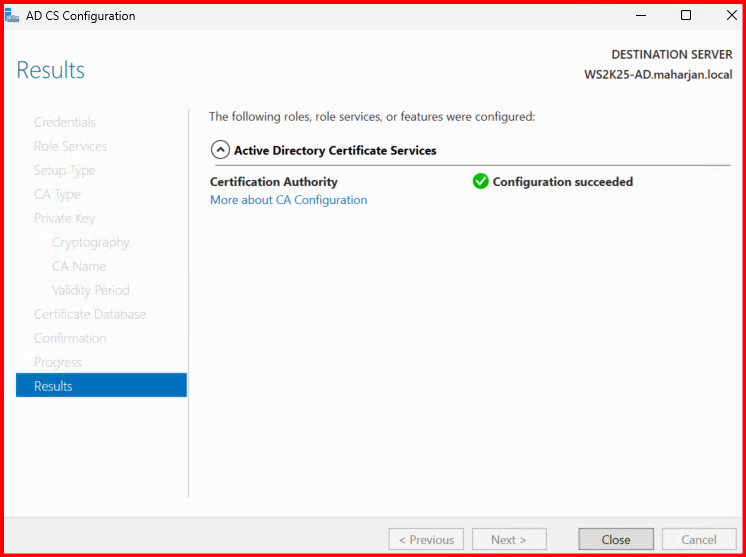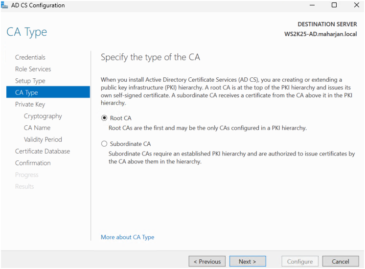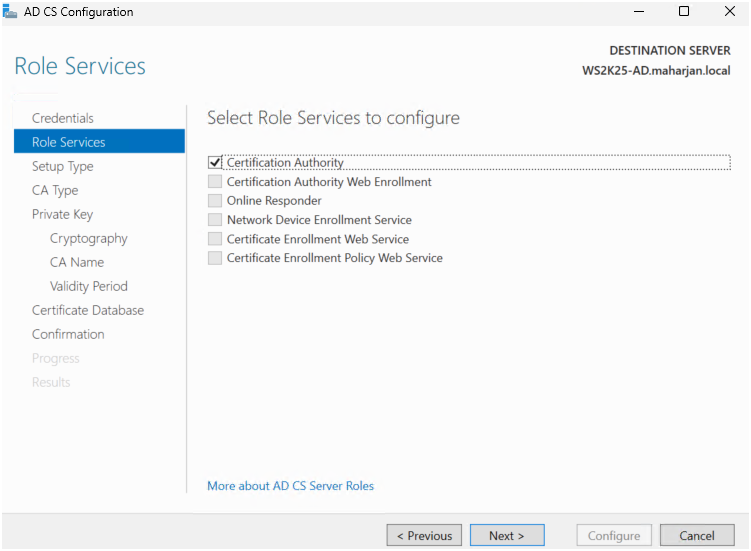 To set up my internal Certificate Authority (CA), I installed and configured Active Directory Certificate Services on my domain-joined Windows Server. Here’s how I did it: