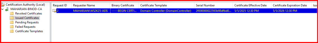 certsrv.msc) to check that the CA is running. - Confirmed the service status and readiness to issue certificates.