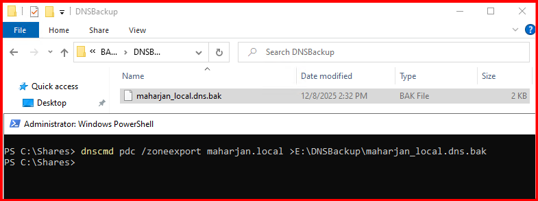 dnscmd pdc /zoneexport maharjan.local >E:\DNSBackup\maharjan_local.dns.bak
