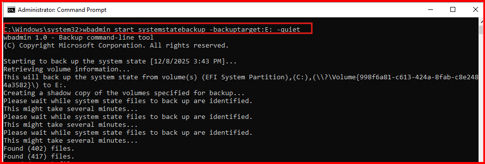 wbadmin start systemstatebackup -backuptarget:E: -quiet