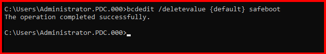 bcdedit /deletevalue {default} safeboot