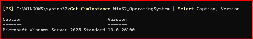 - Run: Get-CimInstance Win32_OperatingSystem | Select Caption, Version