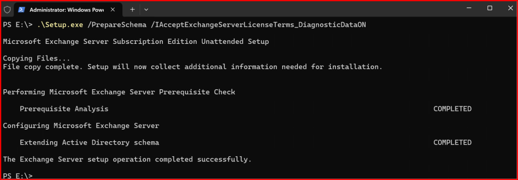 Setup.exe /PrepareSchema /IAcceptExchangeServerLicenseTerms_DiagnosticDataON