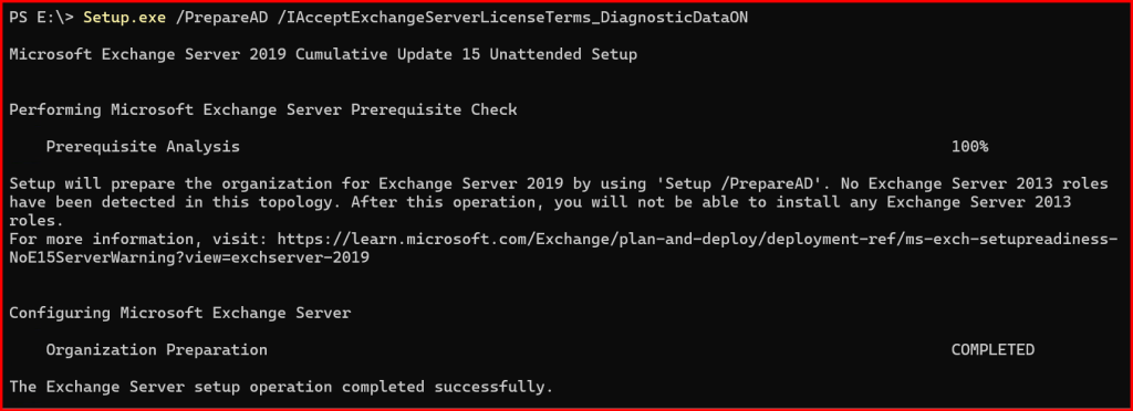Setup.exe /PrepareAD /IAcceptExchangeServerLicenseTerms_DiagnosticDataON