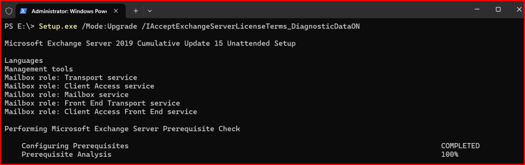 Setup.exe /Mode:Upgrade /IAcceptExchangeServerLicenseTerms_DiagnosticDataON