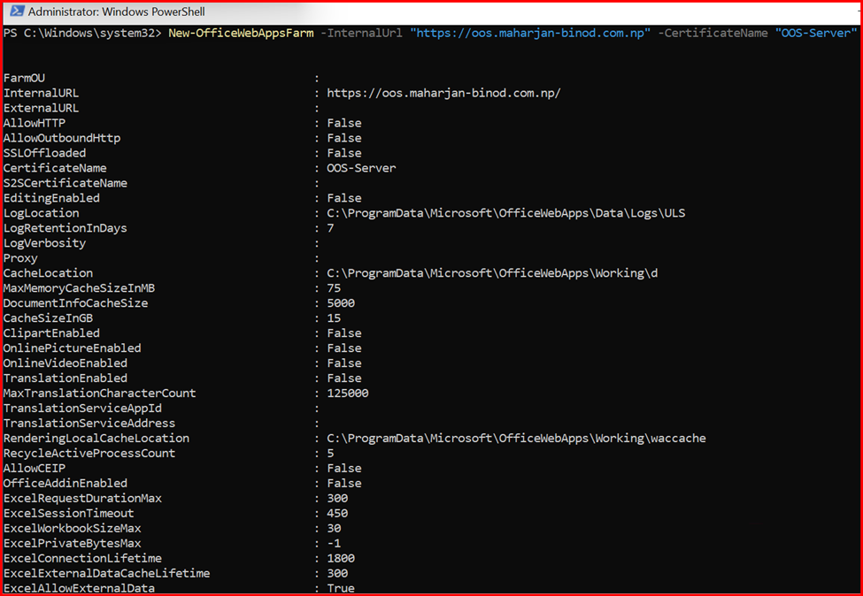 New-OfficeWebAppsFarm -InternalUrl “https://oos.maharjan-binod.com.np” -CertificateName “OOS-Server”