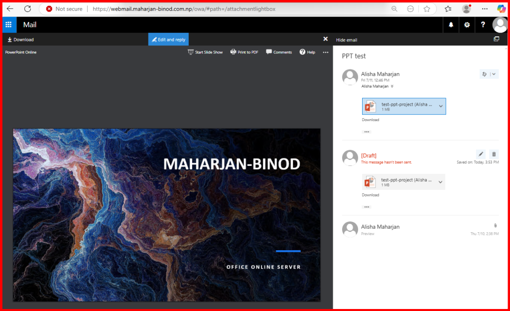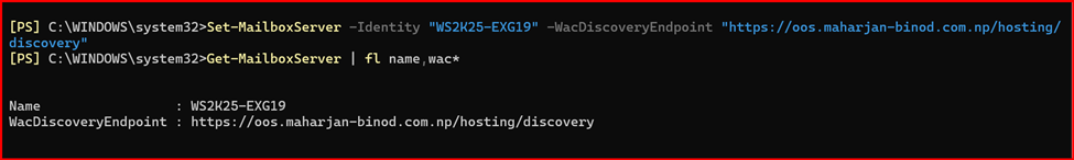 Set-MailboxServer -Identity “WS2K25-EXG19” -WacDiscoveryEndpoint https://oos.maharjan-binod.com.np/hosting/discovery