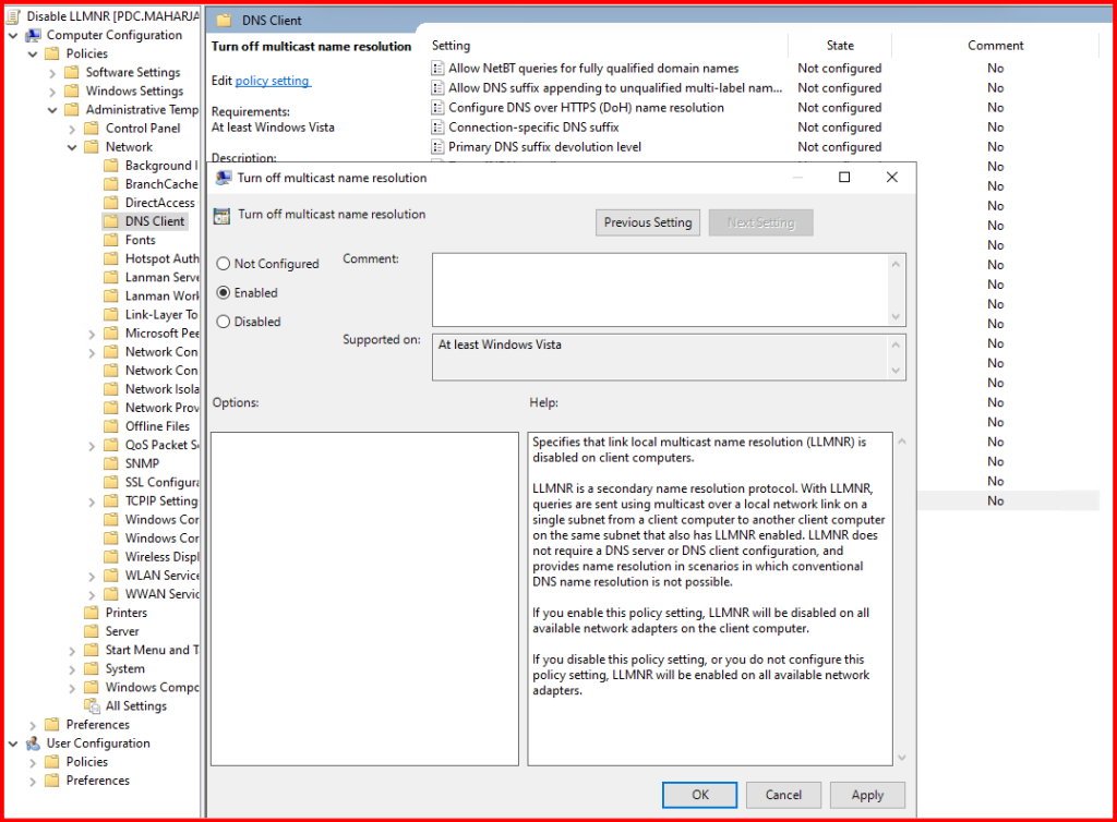 While LLMNR was useful in older or small peer-to-peer networks, in today’s domain-based environments it’s better to disable it for security reasons.