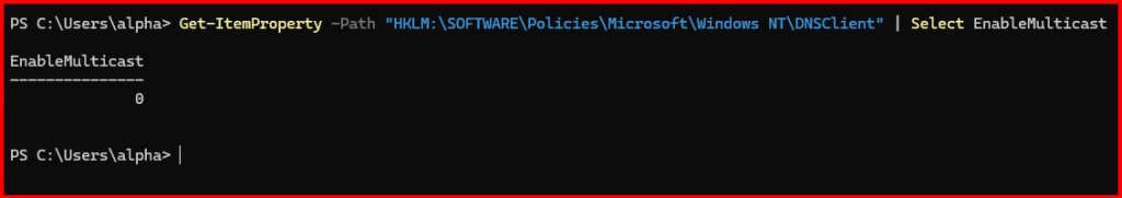 Get-ItemProperty -Path "HKLM:\SOFTWARE\Policies\Microsoft\Windows NT\DNSClient" | Select EnableMulticast