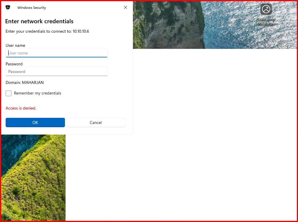 The Windows workstation displayed an “Access is denied” error. We then examined the Kali attacker machine to observe the captured events.