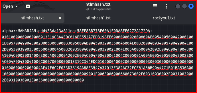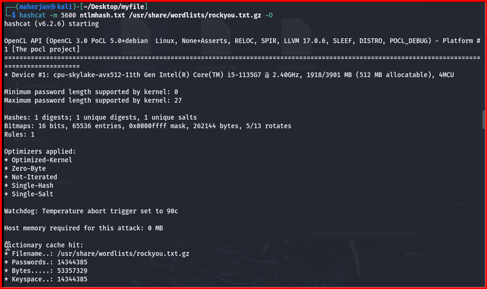 hashcat -m 5600 ntlmhash.txt /usr/share/wordlists/rockyou.txt -O