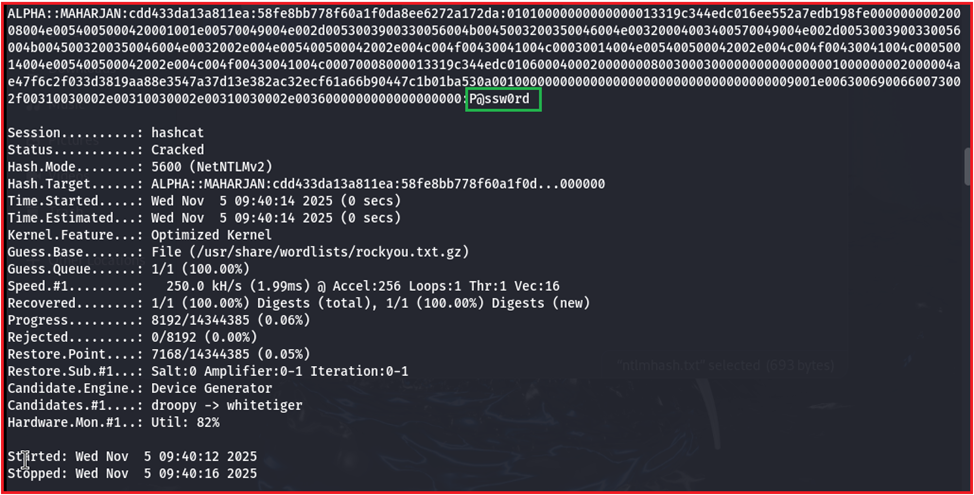 The NTLM hash was cracked with Hashcat and the plaintext password was revealed.