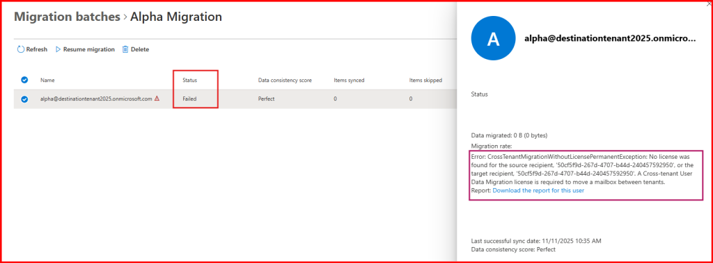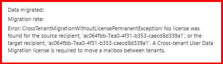 As mentioned earlier in my blog, Cross-Tenant Mailbox Migration requires an appropriate license. The failure occurred because no license was assigned. Once you purchase and assign the Cross-tenant User Data Migration license, the migration process will proceed smoothly without any issues.
