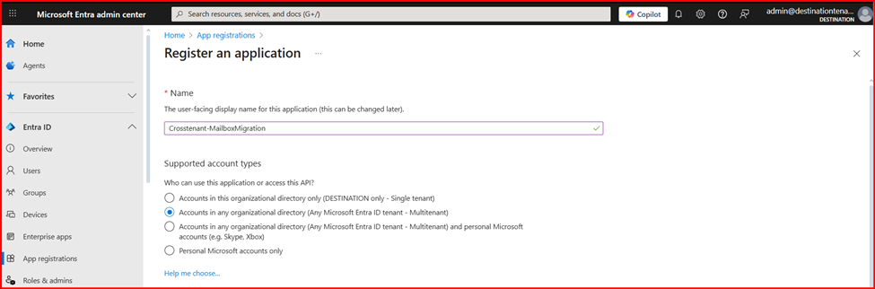 - Enter the name of the application. On the Register an application page, click on Accounts in any organizational directory (Any Microsoft Entra ID tenant – Multitenant), under Supported account types.