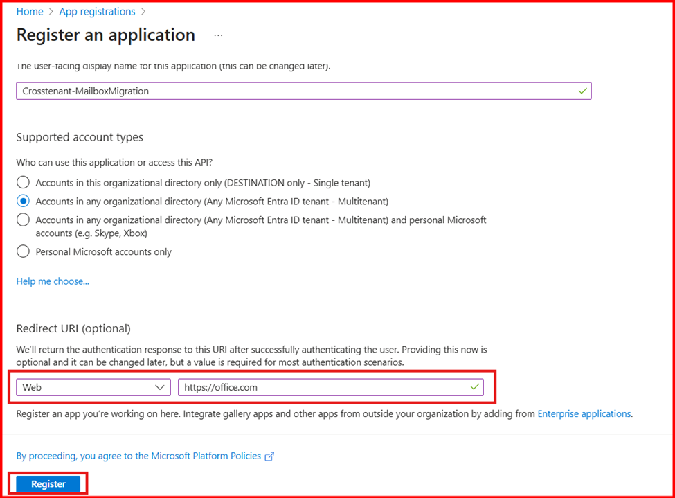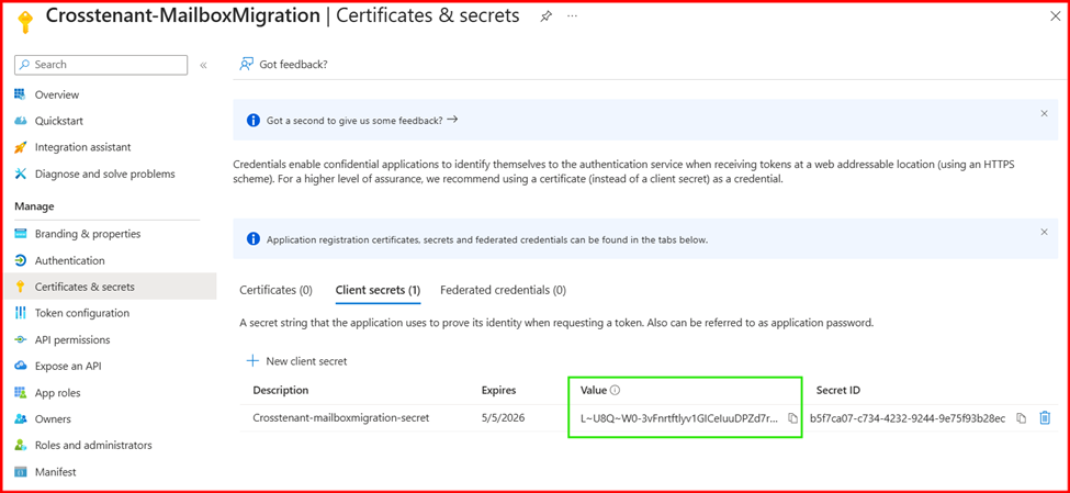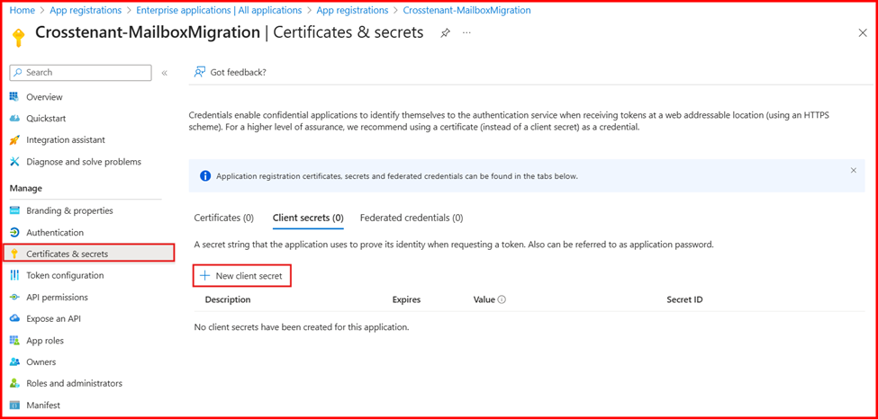The next step is to create a migration application and client secret to set up the destination (target) tenant. Follow these steps: