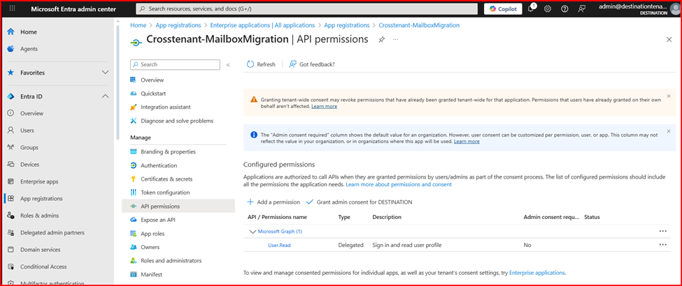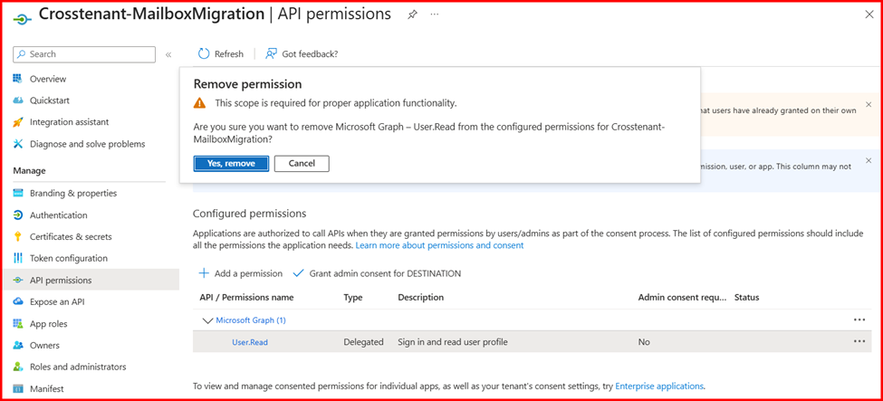 - By default, the User.Read permission is automatically assigned to the application. Since it is not required for mailbox migration, you can safely remove it.