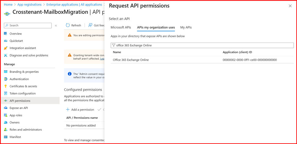 - Click Add a permission. In the new window, under APIs my organization uses, search for and select Office 365 Exchange Online.