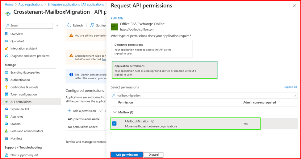 - Select Application permissions. In the Select permissions section, expand Mailbox, choose Mailbox.Migration, and then click Add permissions.