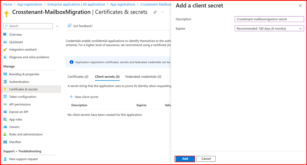 - In the navigation pane, select Certificates & Secrets. Under Client secrets, click New client secret.
