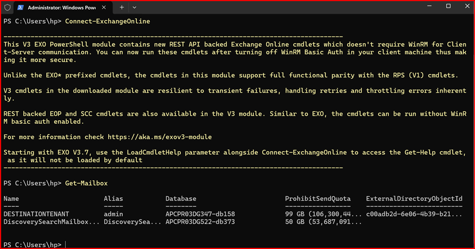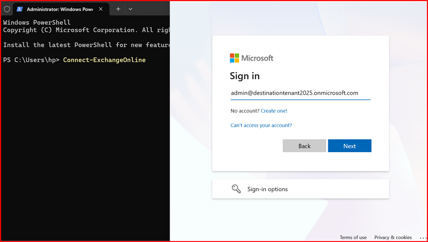 Step2: Connect Exchange Online Power Shell using Destination Tenant Credential.